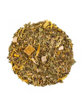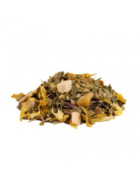 Ingrédients : Maté vert, ananas (ananas, sucre), mangue (mangue, sucre), écorces de citron, arôme naturel goyave, fleurs de souci.