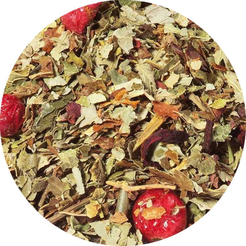 Feuilles de mûre*, feuilles de bouleau*, hibiscus*, ortie*, feuilles d'olivier*, maté vert*, arôme naturel, groseille*.