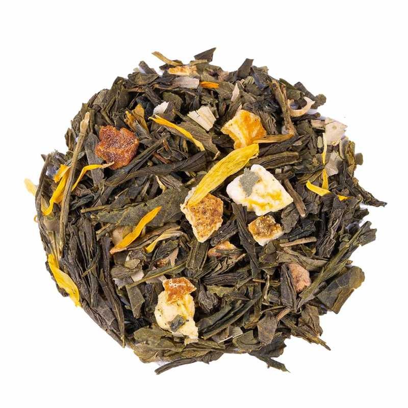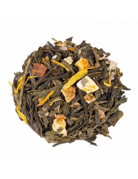 Thé vert China Sencha, thé vert China Sencha extra, morceaux de mangue (8%), écorces d'orange (8%), feuilles d'olivier, arôme naturel, mangue (2%), souci, arôme naturel d'orange sanguine.