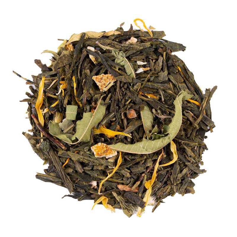Thé vert China Sencha, écorces d'orange, arôme naturel, mélisse, verveine entière, mandarine (2%), souci, passiflore, mangue, fleurs de tilleul, China Jasmin Dragon Pearls. Mélange premium élaboré avec des ingrédients issus de l'agriculture durable et des arômes naturels.