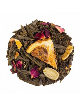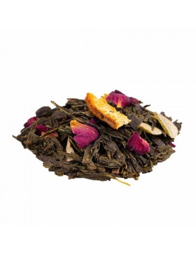 Thé vert China Sencha (76%), pomme, bâtons de cannelle, écorces d'orange, arôme naturel d'orange, AMANDE, pétales de rose, boutons de rose, tranches d'orange, clou de girofle, arôme naturel, vanille.