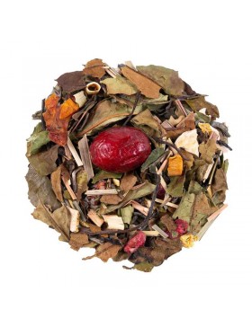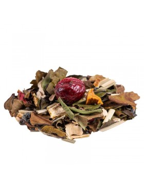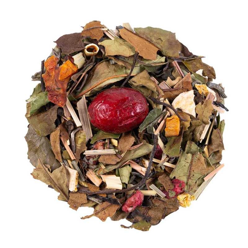 Thé blanc Pai Mu Tan, thé vert China Chun Mee, citronnelle, écorces d'orange, écorces de citron, racine de réglisse, arôme naturel, papaye, gingembre (gingembre, sucre de canne brut), canneberge, grenade.