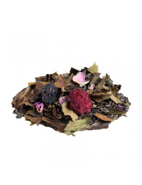 Thé vert China Chun Mee, thé blanc Pai Mu Tan, thé vert China Sencha, arôme naturel, pétales de rose (2%), framboise (2%), aronia, cassis (1%). Mélange premium élaboré avec des ingrédients issus de l'agriculture durable et des arômes naturels.