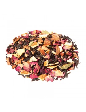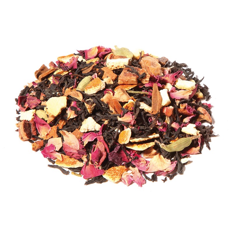 Thé noir Assam*, Inde du Sud*, écorces orange*, pomme*, Cannelle*, arôme naturel, pétales rose*, cardamome*.