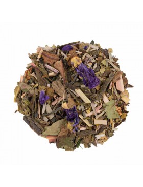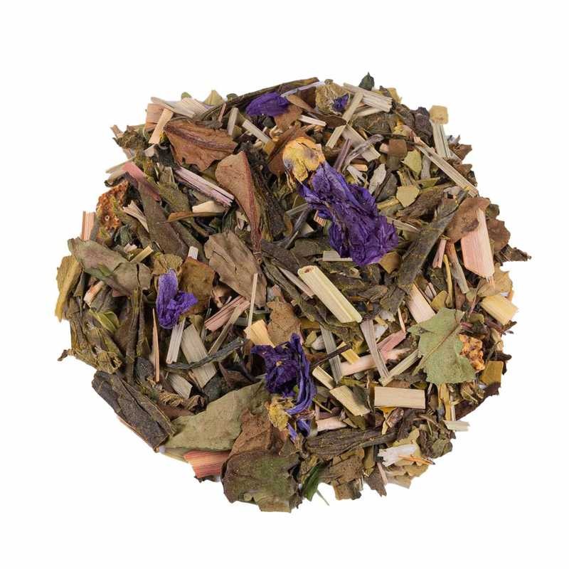Thé vert China Sencha, maté vert, citronnelle (16%), thé blanc Pai Mu Tan, ortie, écorces de citron (9%), arôme naturel, coco , feuilles de moringa, mauve.