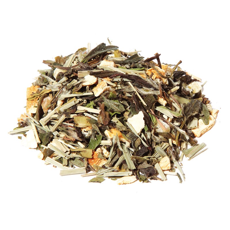 Thé vert China Chun Mee, thé blanc Pai Mu Tan, citronnelle, gingembre (9%), écorces de citron (3%), arôme naturel.