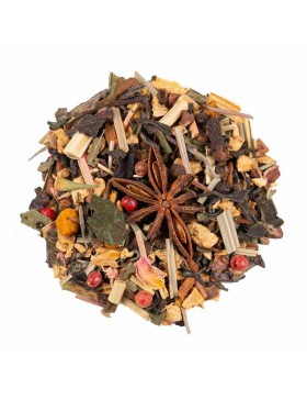 Mélange détox de thé vert, thé blanc et épices : curcuma et gingembre digestifs, cannelle antioxydante, fève de cacao, vanille et rose pour la gourmandise.